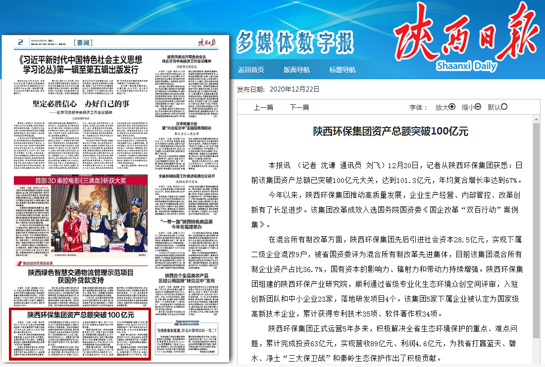 本報訊 (記者 沈謙 通訊員 劉飛)12月20日,記者從陜西環保集團獲悉:日前該集團資產總額已突破100億元大關,達到101.3億元,年均復合增長率達到67%。
