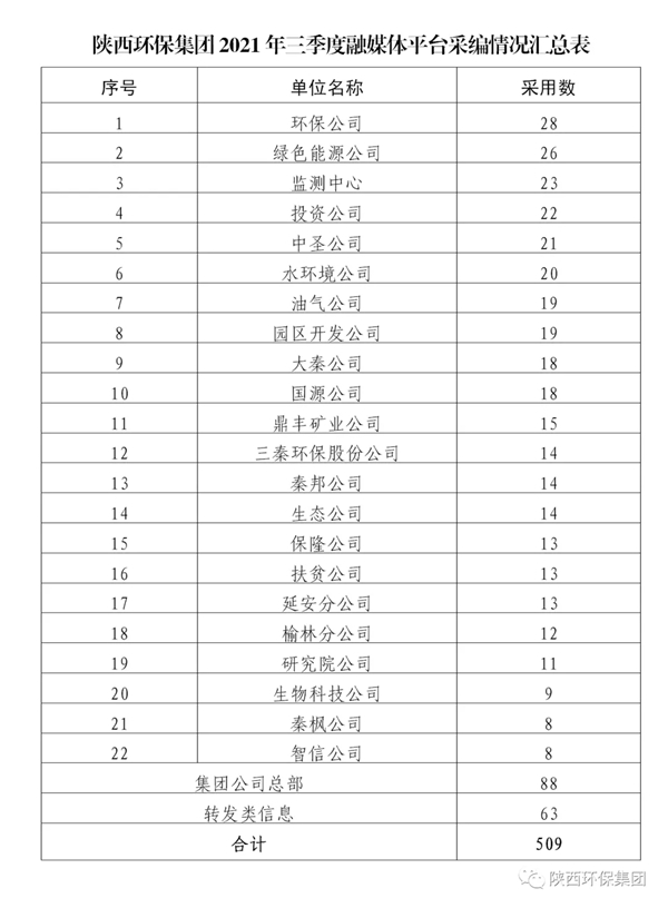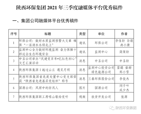 為加強集團公司門戶網(wǎng)站、微信公眾號、新浪微博等融媒體平臺的稿件采編工作,鼓勵廣大通訊員圍繞企業(yè)中心工作撰寫出高質(zhì)量的稿件,發(fā)揮優(yōu)秀稿件的示范作用,為集團高質(zhì)量發(fā)展鼓與呼,按照集團公司《關(guān)于建立政務(wù)信息采用情況通報和優(yōu)秀稿件評選制度的通知》(陜環(huán)司函〔2021〕31號)文件要求,現(xiàn)將2021年三季度集團公司融媒體平臺稿件采用及優(yōu)秀稿件評選情況通報如下: