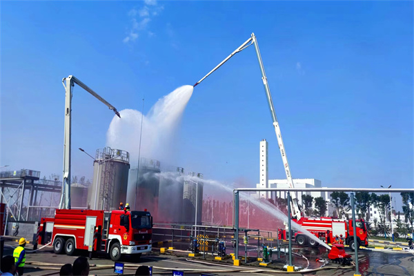 “請各小組就位。”隨著現場總指揮顧峰一聲令下,各應急隊伍聞令而動,勢如破雷,聯動應急演練正式開始。演練模擬甲醇罐車泄漏自燃進行應急處置,火勢引燃罐區,一名操作員輕度燒傷昏迷,從事發第一時間啟動響應程序到開展自救,從事故升級請求外部支援到政企聯動全面開展救援,各行動組分秒必爭、有條不紊,密切配合。地面,十余位曾獲“三等功”榮譽的消防指戰員“逆行”火災一線,耐高溫消防機器人零距離偵察、零距離降溫、零距離滅火、零距離堅守,抗洪搶險排澇車、大噸位水罐消防車快速排澇、穩定供水、“救”在眼前。天空,舉高噴射消防車精確打擊著火點、全面壓制火勢火頭。最終在多兵種聯合作戰,各單位密切配合下現場火情完全撲滅、環境指標恢復正常、污染危害全面消除、應急響應順利終止。