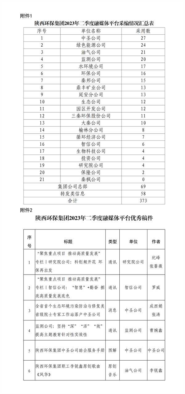 陜西環保集團2023年二季度融媒體平臺稿件采用及優秀稿件評選情況通報