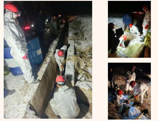 風雪交加,國道溝深路滑,應急救援車行駛了近7個小時后到達現場開展泄露污染物清理工作。由于現場無法使用機械設備,新天地公司應急救援隊人員只能穿好防護服進行人工清理。零下8℃的雪天,隊員們干的大汗淋漓,人群中冒出一股股熱氣。經過近6個小時的緊張作戰,直至深夜,現場共清理污染油泥9.38噸,均運回省危廢處置中心安全處置。