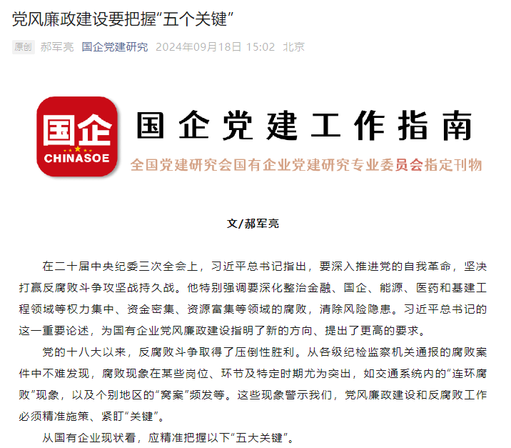 日前出版的《國企》雜志刊發(fā)了陜西環(huán)保集團(tuán)黨委書記、董事長郝軍亮同志文章《黨風(fēng)廉政建設(shè)要把握“五個(gè)關(guān)鍵”》。現(xiàn)刊載如下,以饗讀者。