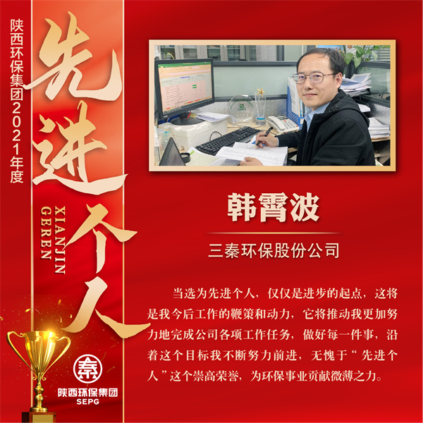 陜西環(huán)保集團2022年工作會議暨二屆一次職代會上表彰了一批敢闖、敢干、敢為人先的先進個人。他們憑借對環(huán)保事業(yè)的執(zhí)著與熱愛,埋頭苦干、厚積薄發(fā),他們懷揣著環(huán)保事業(yè)的遠大夢想,擔(dān)當(dāng)作為、奮斗奉獻,他們用自己的行動詮釋初心使命、國企擔(dān)當(dāng)。現(xiàn)推出“樹立先進 激勵前行”專欄,感悟榜樣精神、凝聚榜樣力量,讓榜樣的光芒化為強大的動力,助力集團高質(zhì)量發(fā)展再上新臺階。